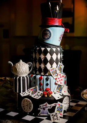 Foto: Procopio Photography Y you're having a fairytale wedding, you can either go subtle or over the top, Y we love how this wedding cake achieves the latter. At this Boda sobre el tema de Alicia en el país de las maravillas , la pareja tenía un pastel de bodas de cinco niveles decorado con cartas de juego, una tetera, relojes, champiñones y, por supuesto, el famoso accesorio de Sombrerero loco.
