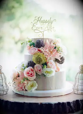 Foto: Aliza Rae Photography Tonelada wedding cake doesn't have to be tall Y extravagant to fit the fairytale wedding aesthYic. This cannoli cake was graced with a happily ever after cake topper as a nod to the theme.